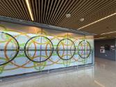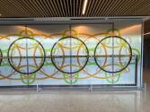 Dinkins describes her work as a series of large-scale dye prints on metal panels that show a set of interconnected Venn diagrams. She says the diagrams signify the complexity of our relation to the systems that influence our lives and other beings — human, non-human and machine. The semi-reflective surface of the mural allows passersby to see themselves and serves as a reminder to always consider the common good when creating systems and technology.